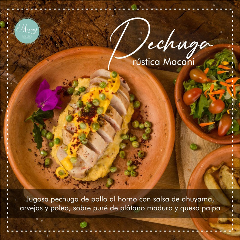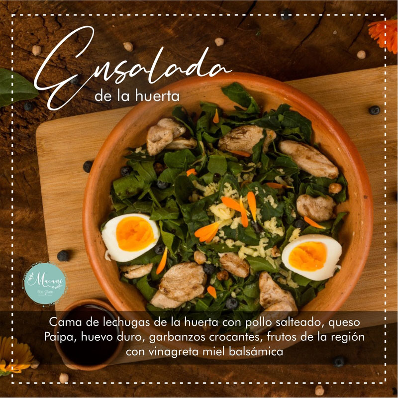 a Macani. Desarrollamos un proyecto de permacultura que visibiliza un ecosistema integrado y respetuoso de cada elemento.Nuestra finca es un bello ecosistema donde habitan animales y plantas: Tenemos una huerta orgánica con cuya cosecha preparamos parte de los alimentos ofrecidos